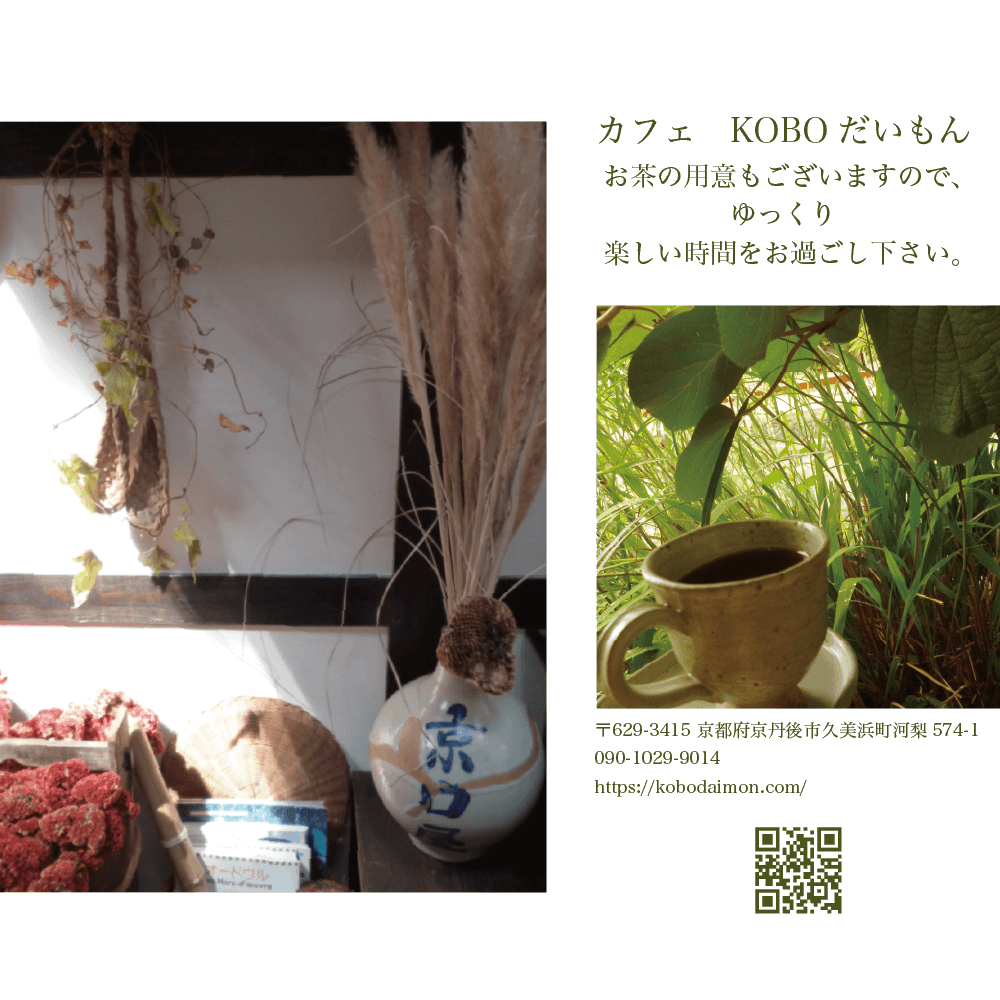 時々ギャラリー&カフェOPENしてます だいもん紀子 常設展 自然豊かな久美浜。 築150年の古民家をアトリエとし、丹後の自然をモチーフに描き続けています。 カフェは不定休となりますので、お電話にてご確認ください。 090-1029-9014 公開済み: 2025年7月31日更新: 2025年7月31日作成者: だいもん紀子カテゴリー: NEWSタグ: オープン, カフェ, ギャラリー