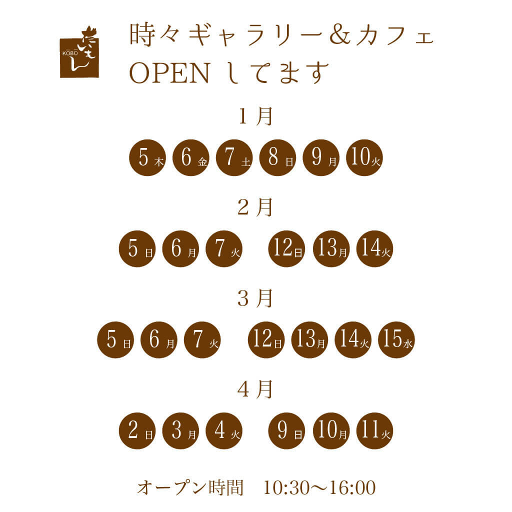 久美浜 時々ギャラリー&カフェ OPENしてます 公開済み: 2022年11月24日更新: 2022年11月24日作成者: だいもん紀子カテゴリー: NEWS 時々ギャラリー&カフェ OPENしてます。 美味しいコーヒーをご用意してお待ちしております。 関連記事 20 KOBOだいもん 2026年カレンダーができました 公開済み: 2025年11月20日更新: 2025年11月20日作成者: だいもん紀子カテゴリー: NEWS だいもん紀子 あそび絵塾 第十六回塾生作品展 公開済み: 2024年8月31日更新: 2024年8月31日作成者: だいもん紀子カテゴリー: NEWS 神戸 時々ギャラリー&カフェ OPENしてます 時々ギャラリー&カフェ OPENしてます。 美味しいコーヒーをご用意してお待ちしております。 公開済み: 2022年11月24日更新: 2022年11月24日作成者: だいもん紀子カテゴリー: NEWS