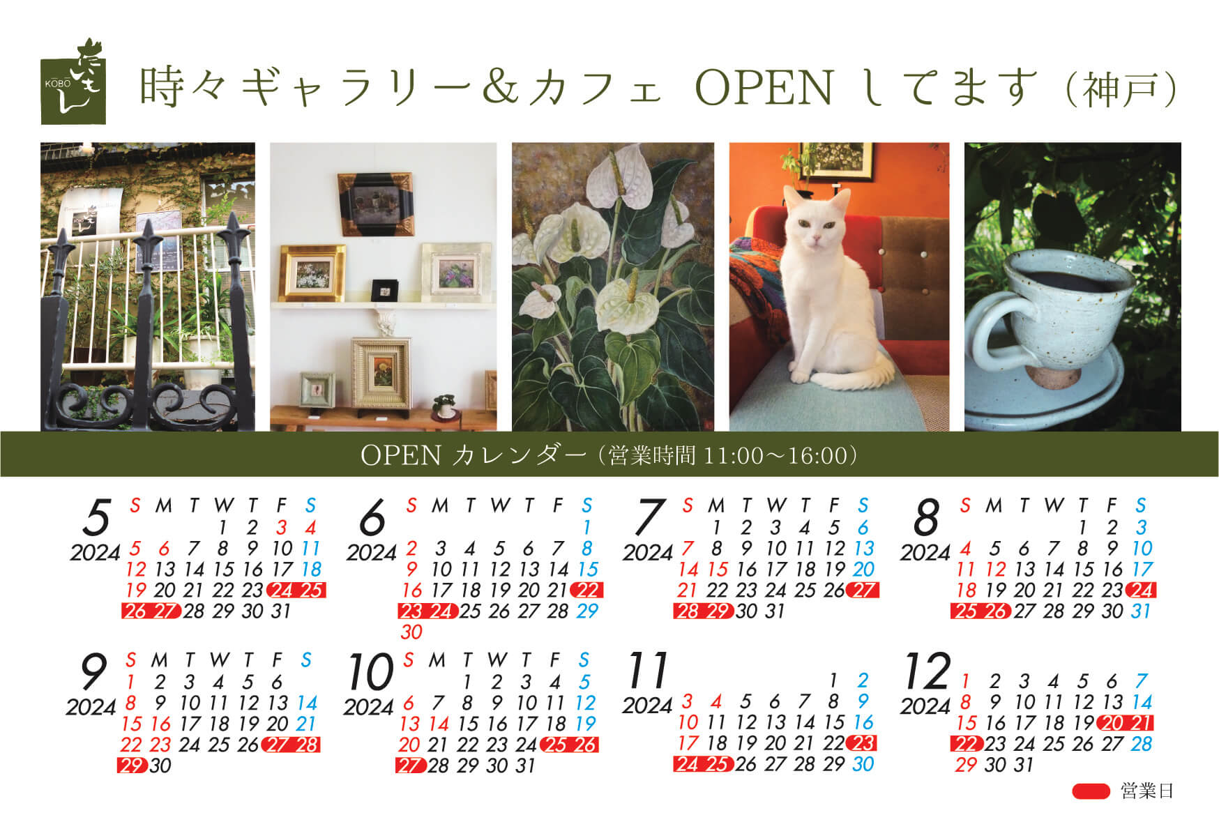 神戸北野 時々ギャラリー&カフェ OPEN日が決まりました 公開済み: 2024年4月30日更新: 2024年5月24日作成者: だいもん紀子カテゴリー: NEWS 関連記事 久美浜 時々ギャラリー&カフェ OPENしてます 2023年10月〜2024年1月 2023 だいもん紀子「初秋から初冬の花展」時々ギャラリー&カフェ OPENしてます。 美味しいコーヒーをご用意してお待ちしております。 公開済み: 2023年8月31日更新: 2023年8月31日作成者: だいもん紀子カテゴリー: NEWS 常設展示のお知らせ だいもん紀子の作品展を行っております。 タイトルは猫と花 PM1:00 〜PM:4:00 2月 28日(金) 29日(土) 3月1日(日)2日(月)27日(金)28日(土)29日(日)30(月) 無料で入場いただけます。 […] 公開済み: 2020年2月4日更新: 2020年2月4日作成者: だいもん紀子カテゴリー: NEWS 久美浜 時々ギャラリー&カフェ OPEN日が決まりました 公開済み: 2024年4月30日更新: 2024年5月24日作成者: だいもん紀子カテゴリー: NEWS