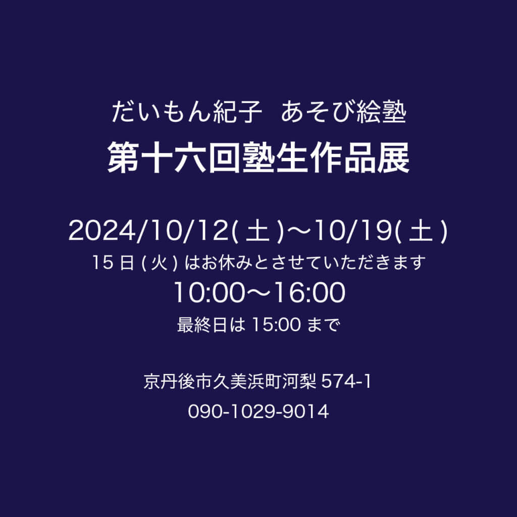 だいもん紀子 あそび絵塾 第十六回塾生作品展 公開済み: 2024年8月31日更新: 2024年8月31日作成者: だいもん紀子カテゴリー: NEWS 関連記事 時々ギャラリー&カフェOPENしてます だいもん紀子 常設展 自然豊かな久美浜。 築150年の古民家をアトリエとし、丹後の自然をモチーフに描き続けています。 カフェは不定休となりますので、お電話にてご確認ください。 090-1029-9014 公開済み: 2025年7月31日更新: 2025年7月31日作成者: だいもん紀子カテゴリー: NEWSタグ: オープン, カフェ, ギャラリー 神戸北野 時々ギャラリー&カフェ OPEN日が決まりました 公開済み: 2024年4月30日更新: 2024年5月24日作成者: だいもん紀子カテゴリー: NEWS 時々ギャラリーOPENします パーソナルギャラリー板絵と木版画展 1976年〜1980年作 公開済み: 2020年12月24日更新: 2020年12月24日作成者: だいもん紀子カテゴリー: NEWS