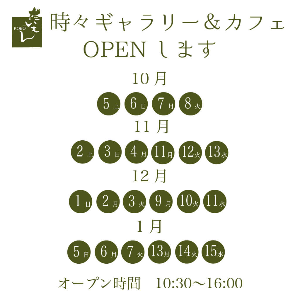 久美浜 時々ギャラリー&カフェ OPEN日が決まりました 2024年10月〜2025年1月 公開済み: 2024年8月31日更新: 2024年8月31日作成者: だいもん紀子カテゴリー: NEWS 関連記事 永らくご迷惑をおかけしました、時々ギャラリーOPENします 永らくご迷惑をおかけしました。 7月1日に退院いたしました。 時々ギャラリーOPENします。 美味しいコーヒーをご用意してお待ちしております。 公開済み: 2021年7月29日更新: 2021年7月29日作成者: だいもん紀子カテゴリー: NEWS 久美浜 時々ギャラリー&カフェ OPEN日が決まりました 公開済み: 2024年4月30日更新: 2024年5月24日作成者: だいもん紀子カテゴリー: NEWS 久美浜 時々ギャラリー&カフェ OPENしてます 時々ギャラリー&カフェ OPENしてます。 美味しいコーヒーをご用意してお待ちしております。 公開済み: 2022年11月24日更新: 2022年11月24日作成者: だいもん紀子カテゴリー: NEWS