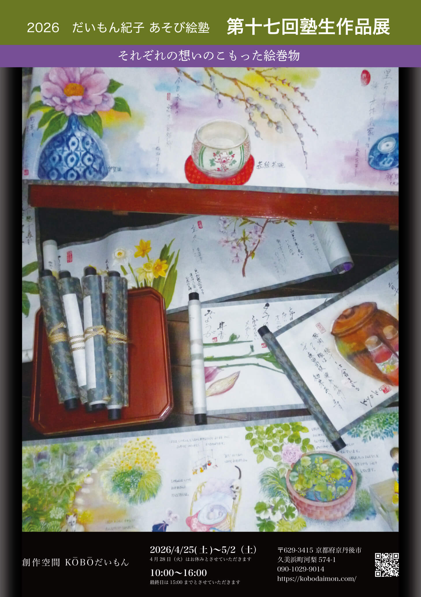 だいもん紀子あそび絵塾 2026年 塾生作品展 公開済み: 2026年1月22日更新: 2026年1月22日作成者: だいもん紀子カテゴリー: NEWS だいもん紀子あそび絵塾 2026年 塾生作品展 2026/4/25(土)〜5/2(土)10:00〜16:00※4月28日(火)はお休みとさせていただきます。最終日は15:00までとさせていただきます。 〒629-3415 京都府京丹後市久美浜町河梨574-1090-1029-9014https://kobodaimon.com/ 関連記事 永らくご迷惑をおかけしました、時々ギャラリーOPENします 永らくご迷惑をおかけしました。 7月1日に退院いたしました。 時々ギャラリーOPENします。 美味しいコーヒーをご用意してお待ちしております。 公開済み: 2021年7月29日更新: 2021年7月29日作成者: だいもん紀子カテゴリー: NEWS 時々ギャラリーOPENします 時々ギャラリーOPENします 11月のオープン予定は、15日、16日、18日、19日です。 12月のオープン予定は、13日、14日、15日、16日です。 1月のオープン予定は、10日、11日、12日、13日です。 &nb […] 公開済み: 2020年11月2日更新: 2020年11月2日作成者: だいもん紀子カテゴリー: NEWSタグ: オープン, カフェ, ギャラリー 神戸 時々ギャラリー&カフェ OPENしてます 2023年10月〜2024年1月 2023 だいもん紀子「スケッチ&クロッキー」時々ギャラリー&カフェ OPENしてます。 美味しいコーヒーをご用意してお待ちしております。 公開済み: 2023年8月31日更新: 2023年8月31日作成者: だいもん紀子カテゴリー: NEWS